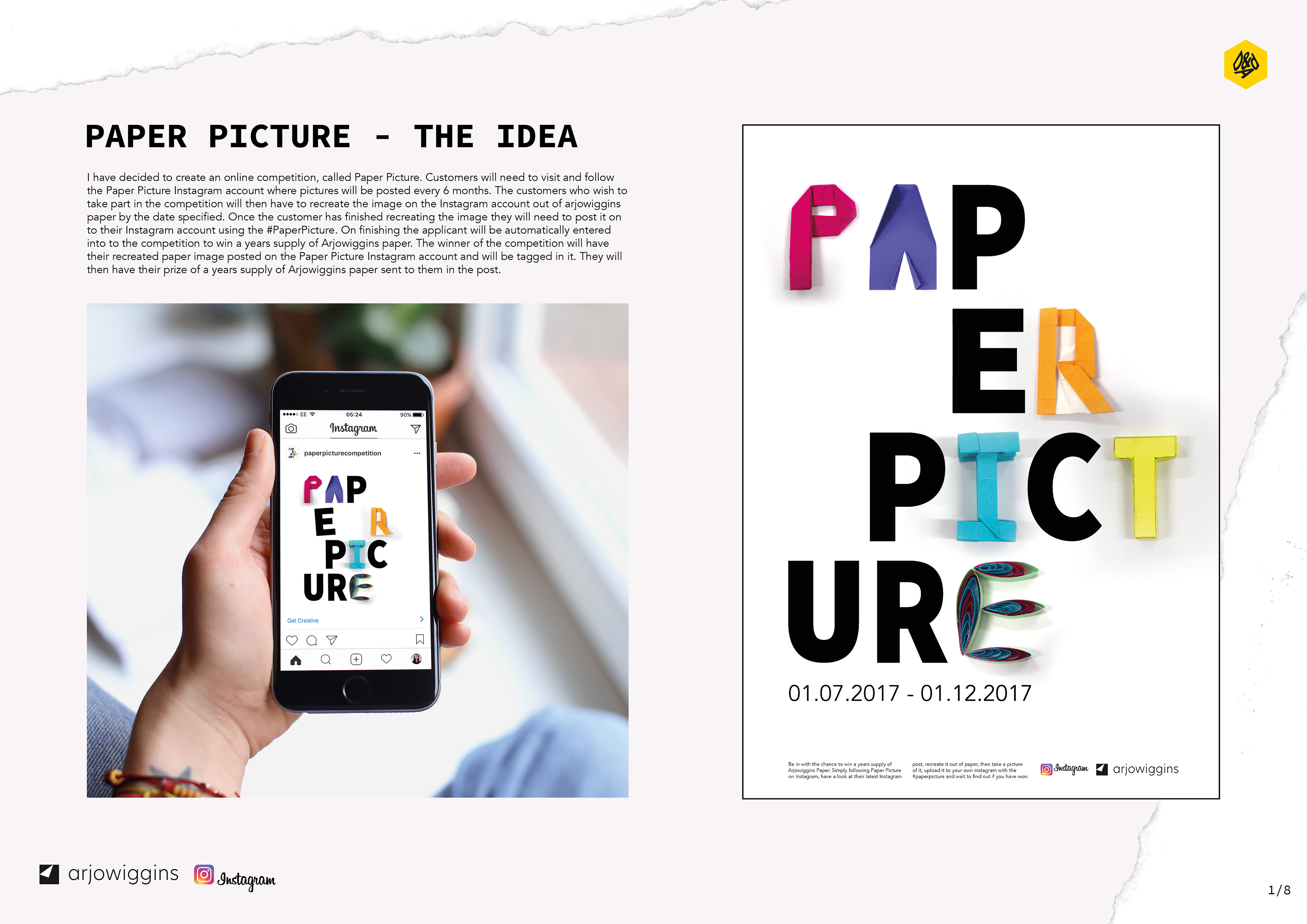 Brief: Put Arjowiggins Creative Papers at the heart of a campaign, initiative, product or service for Facebook, Instagram or Sony Music and remind digital customers of the power of paper. Response: I created an online competition, called Paper Picture. Customers will need to visit and follow the Paper Picture Instagram account where pictures will be posted every 6 months. The customers who wish to take part in the competition will then have to recreate the image on the Instagram account out of arjowiggins paper by the date speci ed. Once the customer has nished recreating the image they will need to post it on to their Instagram account using the #PaperPicture and woud be entered into a competition to win a years supply of Arjowiggins paper.